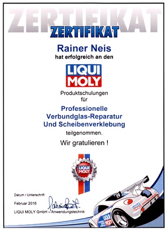 Teilnahmezertifikat an der Liqui Moly Produktschulung für "Professionelle Verbundglas-Reparatur und Scheibenverklebung"