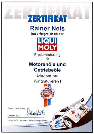 Teilnahmezertifikat an der Liqui Moly Produktschulung für "Motorenöle und Getriebeöle"